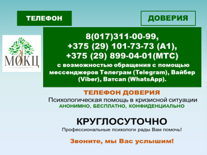 Обратиться за экстренной психологической помощью можно позвонив на «Телефон доверия» Минского областного клинического центра «Психиатрия-наркология» по номерам: